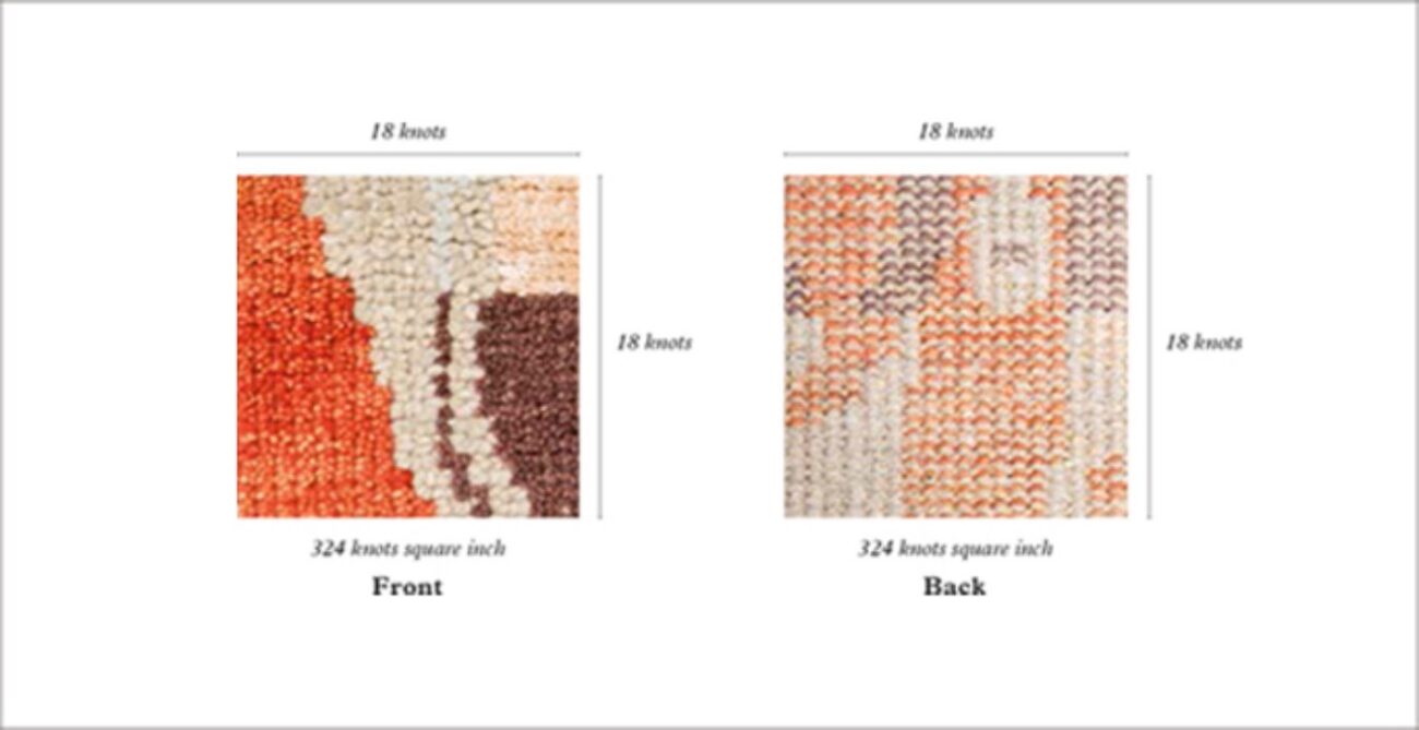 Turn a hand-knotted rug over and count the individual knots you can see running vertically for 1’’ and then horizontally for 1’’. Multiplying these two figures together will give you the overall KPSI.