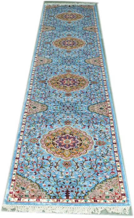 Art silk carpets are made using synthetic fibers like viscose or polyester, designed to replicate the softness and sheen of