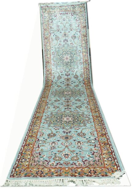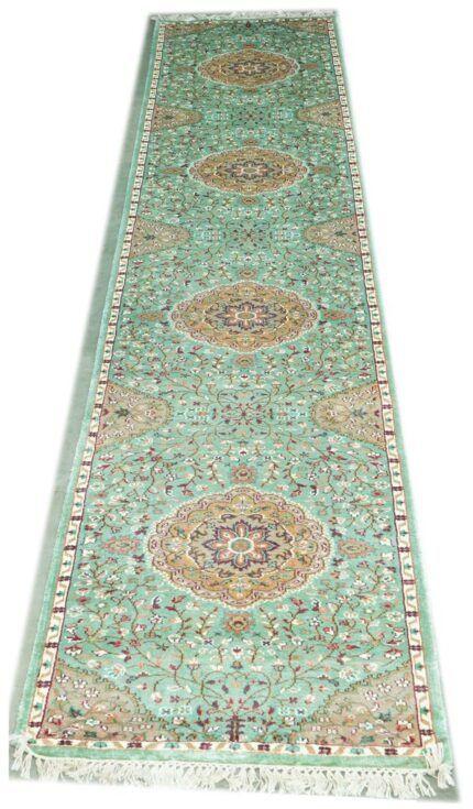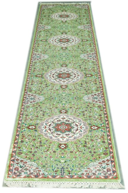 Art silk carpets are made using synthetic fibers like viscose or polyester, designed to replicate the softness and sheen of